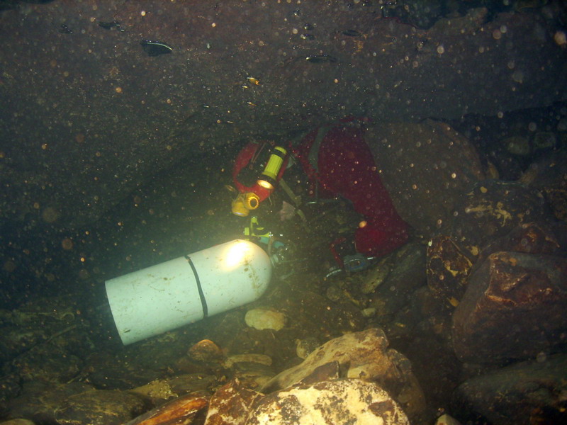 finally I reach a wider area, so rolling back to 60cm, with a slight slope from 20 to 30 degrees downstream. The tips of fins, I feel a bedrock or gravel, good sign for the rest behind me. I'm 8m below the surface of S2 and I remain there.